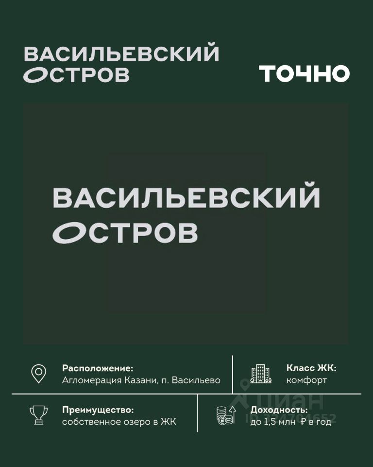 ЖК "Васильевский остров" — масштабный проект ТОЧНО в Казанской агломерации. Просторная территория 88 Га спроектирована для комфортной жизни: озеро с набережной и пляжем, каток, зелёные маршруты. В проекте комплекса — школа на 1 224 места, 2 детских сада на 680 мест, детская и взрослая поликлиники, фитнес-центр с бассейном, термальный комплекс, фермерский рынок, магазины, кафе и рестораны.