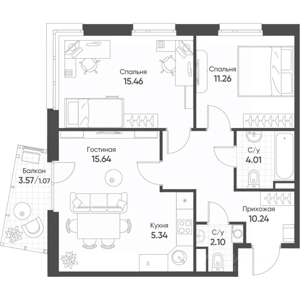 3-комн. от 57,22 м²