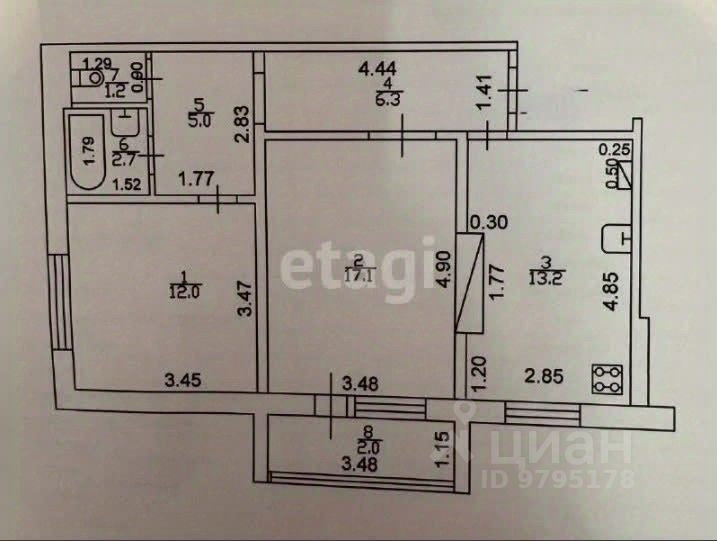 спальня 12 кв.м., зал 17,1 кв.м., кухня 13,2 кв.м.;