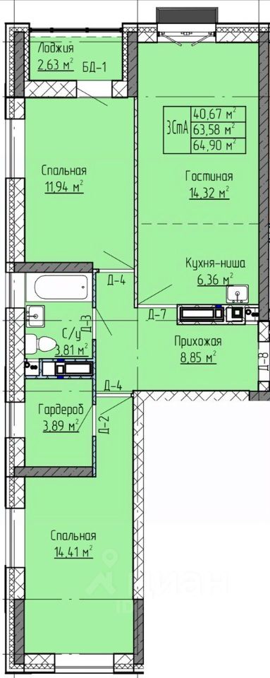 3-комн. от 64,9 м²
