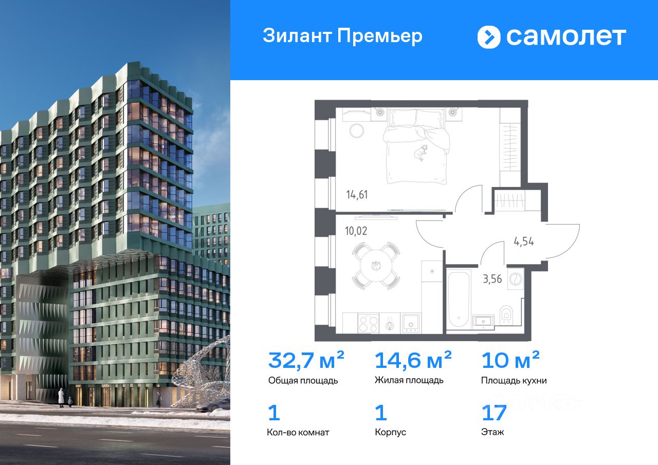 Строим кварталы для жизни с заботой о будущем. Предлагается 1-комнатная квартира комфорт-класса 32,73 кв.м в корпусе 1 на 17 этаже, в ЖК "Зилант Премьер"