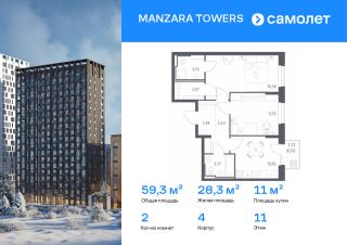 Строим кварталы для жизни с заботой о будущем. Предлагается 2-комнатная квартира комфорт-класса 59,34 кв.м в корпусе 4 на 11 этаже, в MANZARA TOWERS