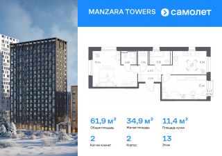 Строим кварталы для жизни с заботой о будущем. Предлагается 2-комнатная квартира комфорт-класса 61,94 кв.м в корпусе 2 на 13 этаже, в MANZARA TOWERS