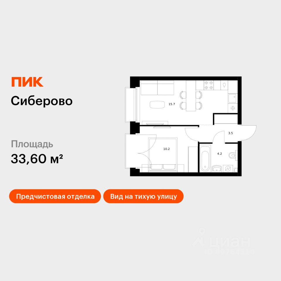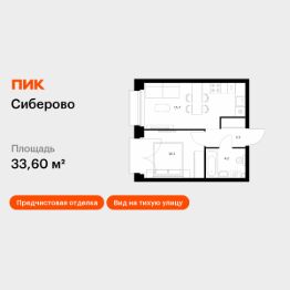 Продаётся 1-комн. квартира площадью 33,6 кв.м на 11 этаже 14 этажного дома (Корпус 2, Секция 5) проекта ПИК Сиберово. Светлый просторный подъезд на уровне земли, функциональная планировка, большие окна, предчистовая отделка.