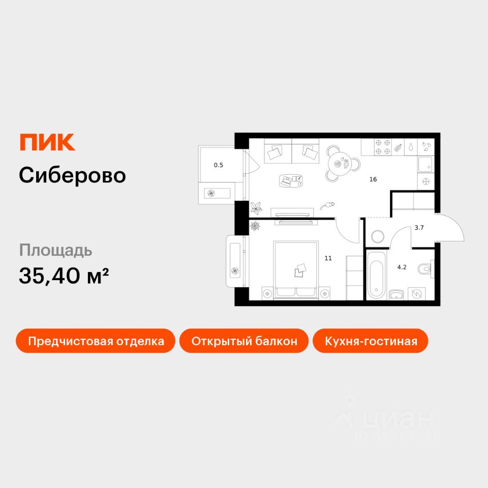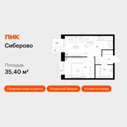 Продаётся 1-комн. квартира площадью 35,4 кв.м на 6 этаже 16 этажного дома (Корпус 3, Секция 1) проекта ПИК Сиберово. Светлый просторный подъезд на уровне земли, функциональная планировка, большие окна, предчистовая отделка.