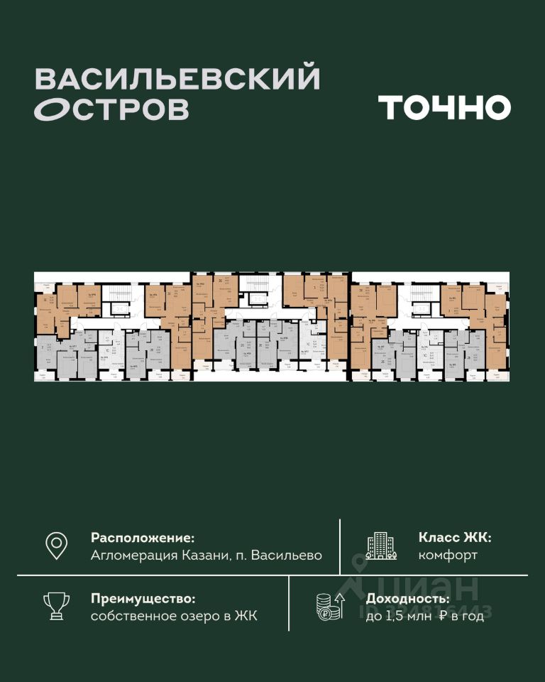ЖК "Васильевский остров" — масштабный проект ТОЧНО в Казанской агломерации. Просторная территория 88 Га спроектирована для комфортной жизни: озеро с набережной и пляжем, каток, зелёные маршруты. В проекте комплекса — школа на 1 224 места, 2 детских сада на 680 мест, детская и взрослая поликлиники, фитнес-центр с бассейном, термальный комплекс, фермерский рынок, магазины, кафе и рестораны.