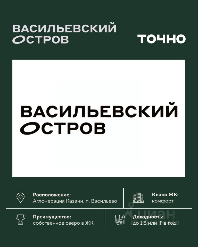 ЖК "Васильевский остров" — масштабный проект ТОЧНО в Казанской агломерации. Просторная территория 88 Га спроектирована для комфортной жизни: озеро с набережной и пляжем, каток, зелёные маршруты. В проекте комплекса — школа на 1 224 места, 2 детских сада на 680 мест, детская и взрослая поликлиники, фитнес-центр с бассейном, термальный комплекс, фермерский рынок, магазины, кафе и рестораны.