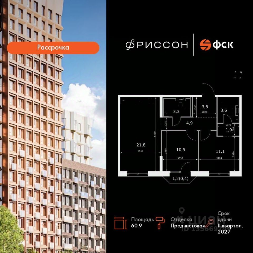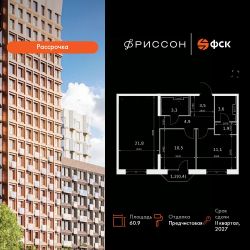 Продаётся 2-к квартира номер 27 общей площадью 60.9 кв.м. на 6-м этаже 20 этажного здания. Отделка Whitebox. Цена с учётом скидки.
