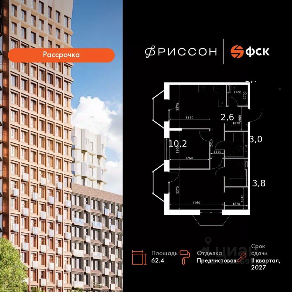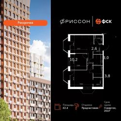 Продаётся 2-к квартира номер 367 общей площадью 62.4 кв.м. на 8-м этаже 14 этажного здания. Отделка Whitebox. Цена с учётом скидки.