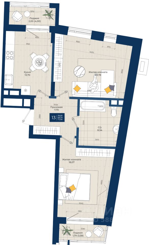Жилой комплекс "Максат", Квартира 13 общей площадью 72,58 м2 на 5 этаже.