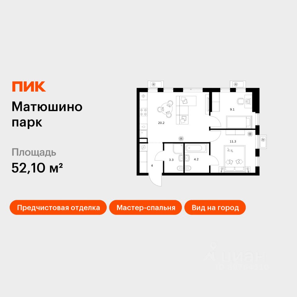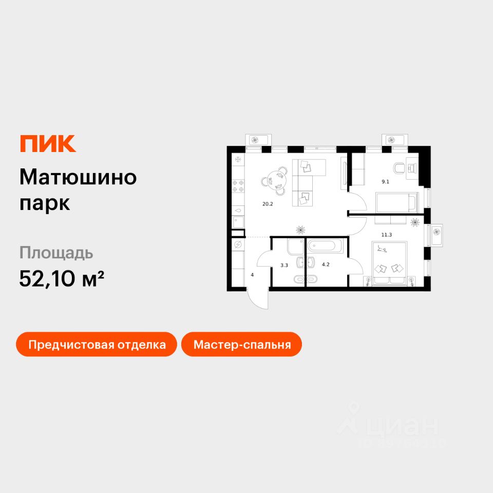 Продаётся 2-комн. квартира площадью 52,1 кв.м на 8 этаже 9 этажного дома (Корпус 4, Секция 1) проекта ПИК Матюшино парк. Светлый просторный подъезд на уровне земли, функциональная планировка, большие окна, предчистовая отделка.