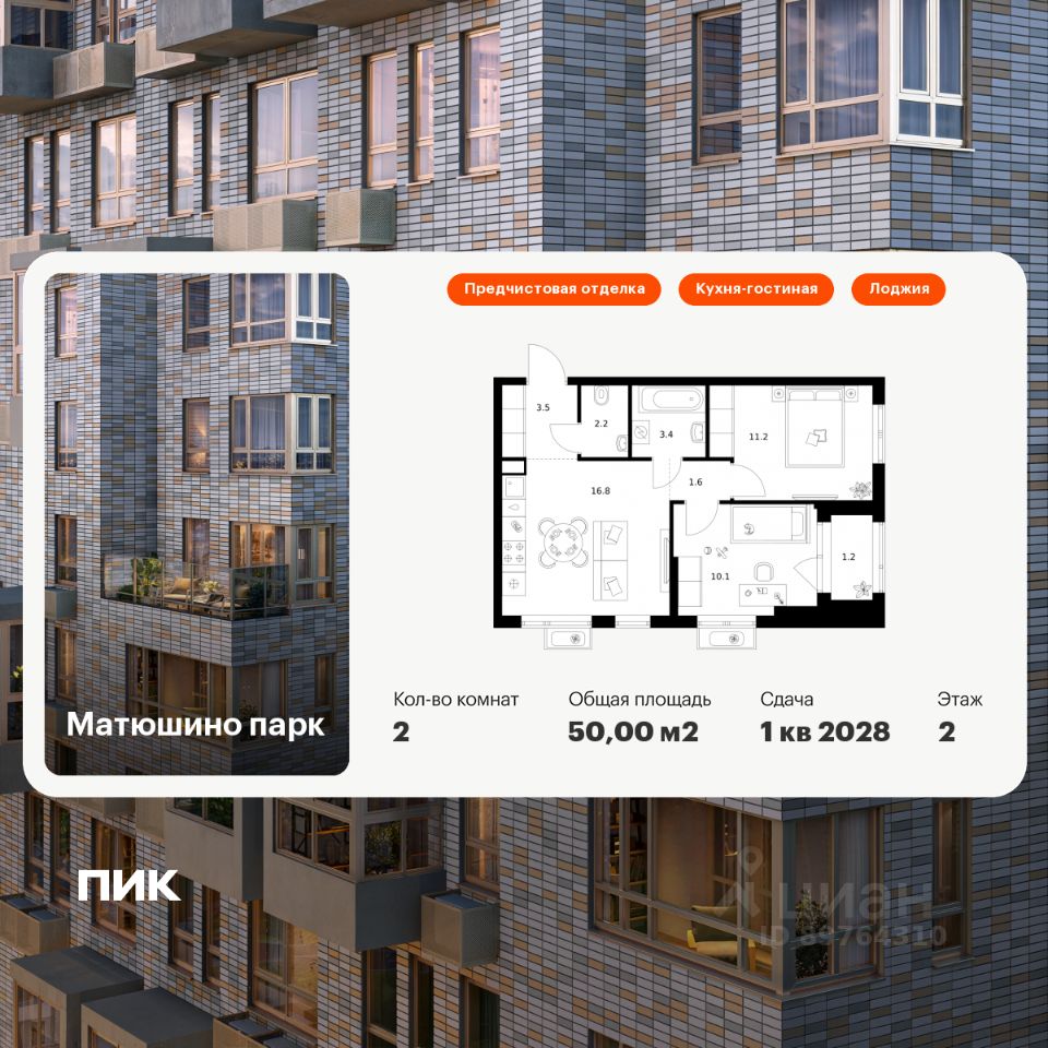 Продаётся 2-комн. квартира площадью 50 кв.м на 2 этаже 17 этажного дома (Корпус 3, Секция 1) проекта ПИК Матюшино парк. Светлый просторный подъезд на уровне земли, функциональная планировка, большие окна, предчистовая отделка.