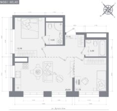 Продаётся 2-комнатная квартира в строящемся доме (Дом 1), срок сдачи: IV-кв. 2027, общей площадью 60.4 кв.м., на 2 этаже.