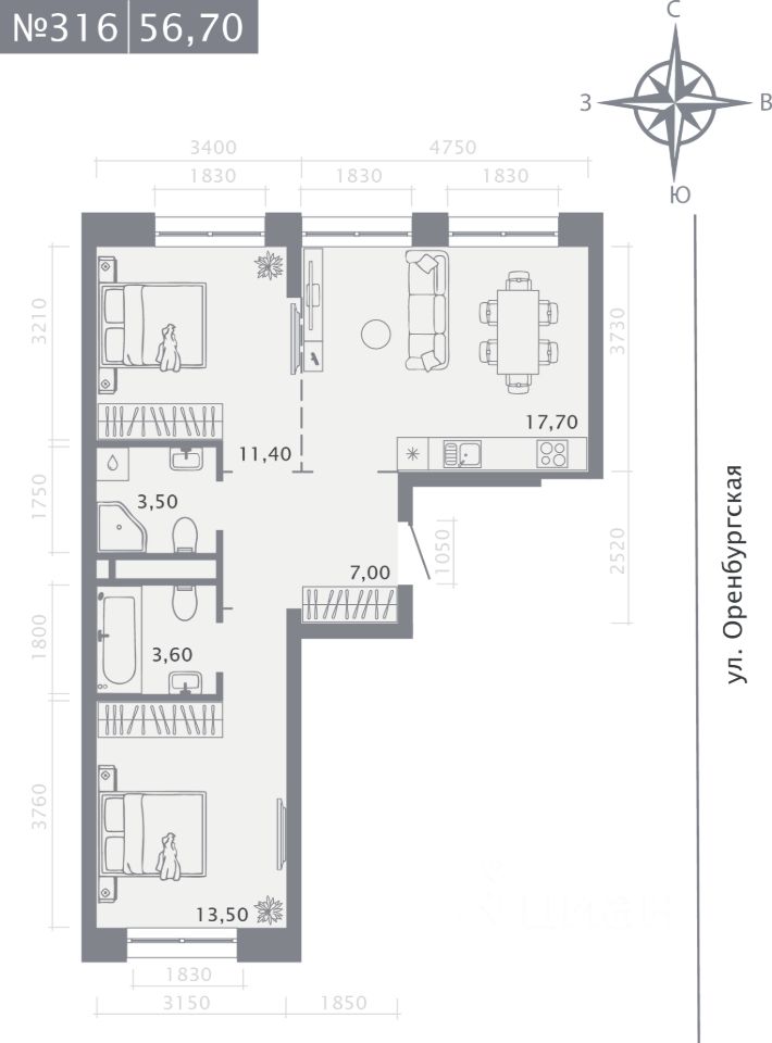 Продаётся 2-комнатная квартира в строящемся доме (Корпус 2 (2 этап)), срок сдачи: IV-кв. 2028, общей площадью 56.7 кв.м., на 2 этаже. Новый жилой комплекс "Оригана" от застройщика "КамаСтройИнвест" расположен по адресу: Россия, Республика Татарстан, Казань, улица Оренбургский Тракт