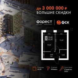 Продаётся 1-к квартира номер 110 общей площадью 35.3 кв.м. на 4-м этаже 4 этажного здания. Отделка Whitebox. Цена с учётом скидки.