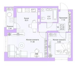 Удобная планировка квартиры: Большая прихожая- 7 кв.м 1 жилая комната-10 кв.м 2 жилая комната+кухня-17 кв.м +9 кв.м Лоджия-1,44 кв.м С/у-4,1 кв.м Квартира ждет своих хозяев! Хороший вариант для жизни и инвестиций.
