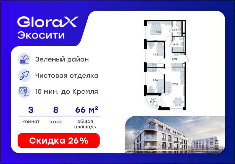 Продается 3-комн. квартира на 8-м этаже в строящемся проекте GloraX Экосити. Общая площадь лота составляет 66,96 кв. м, из которых 30,94 кв. м отведено под жилую и 19,40 кв. м под кухонную зону. Номер квартиры - 254