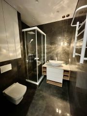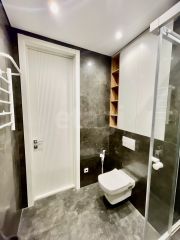 - совмещённый санузел 4,5 кв.м. с угловой ванной, дизайнерским умывальником и инсталяцией с гигиеническим душем, в нише установлен водонагреватель и полки;