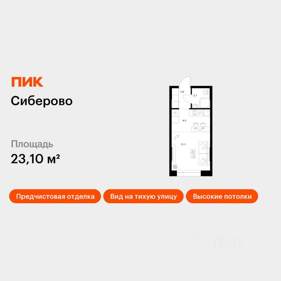 Продаётся квартира-студия площадью 23,1 кв.м на 1 этаже 16 этажного дома (Корпус 3, Секция 5) проекта ПИК Сиберово. Светлый просторный подъезд на уровне земли, функциональная планировка, большие окна, предчистовая отделка.