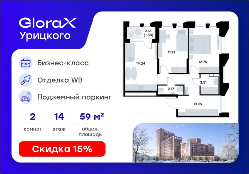 Продается 2-комн. квартира на 14-м этаже в квартале бизнес-класса GloraX Урицкого. Общая площадь лота составляет 59,36 кв. м, из которых 24,67 кв. м отведено под жилую и 14,24 кв. м под кухонную зону. Номер квартиры - 170