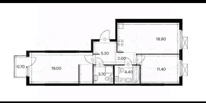Площадь: кухня-гостиная 18.9 кв.м. + 2 комнаты.