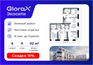 Продается 4-комн. квартира на 9-м этаже в строящемся проекте GloraX Экосити. Общая площадь лота составляет 92,16 кв. м, из которых 42,10 кв. м отведено под жилую и 20,37 кв. м под кухонную зону. Номер квартиры - 406