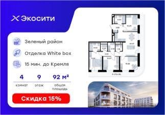 Продается 4-комн. квартира на 9-м этаже в строящемся проекте Экосити. Общая площадь лота составляет 92,16 кв. м, из которых 42,10 кв. м отведено под жилую и 20,37 кв. м под кухонную зону. Номер квартиры - 406