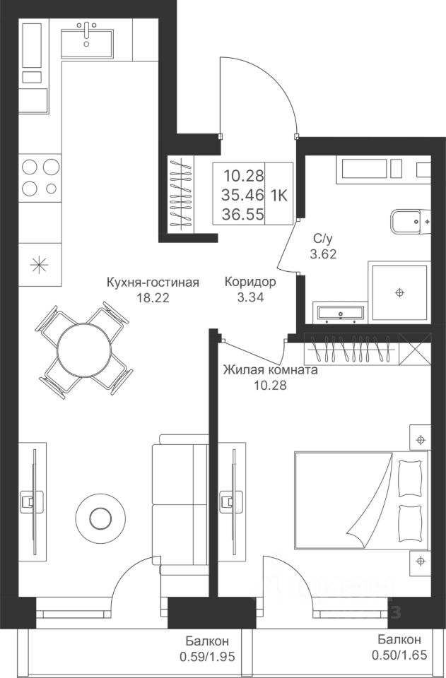 Уютная и продуманная 1-комнатная квартира с просторной жилой комнатой и кухней. Удачное зонирование на гостевое и личное пространство.