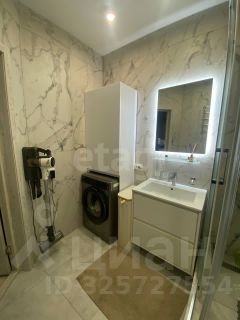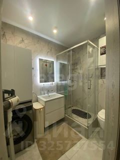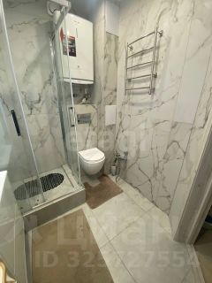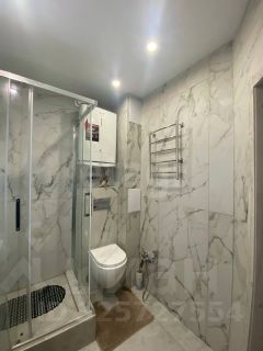Санузел совмещенный, стены и пол в плитке, душевая кабина.