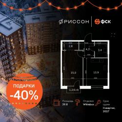 Продаётся 1-к квартира номер 25 общей площадью 39.8 кв.м. на 6-м этаже 20 этажного здания. Отделка Whitebox. Цена с учётом скидки.