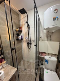Санузел совмещенный. Современная душевая кабина. водонагреватель, стиральная машина, зеркало с подсветкой.