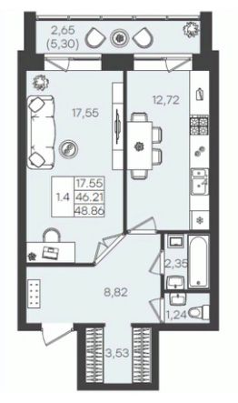 Продаётся 1-комнатная квартира 14 в доме 1 общей площадью 48.86 кв.м