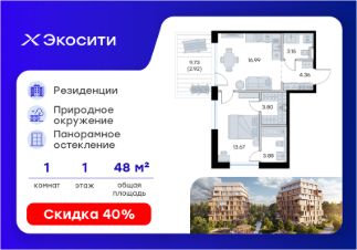 Продается 1-комн. квартира на 1-м этаже в строящемся проекте Экосити. Общая площадь лота составляет 48,77 кв. м, из которых 13,67 кв. м отведено под жилую и 16,99 кв. м под кухонную зону. Номер квартиры - 5