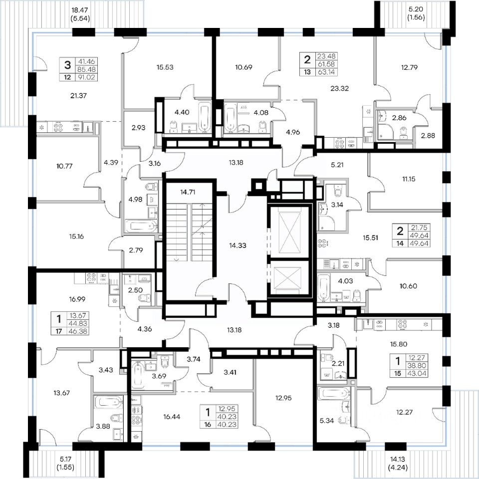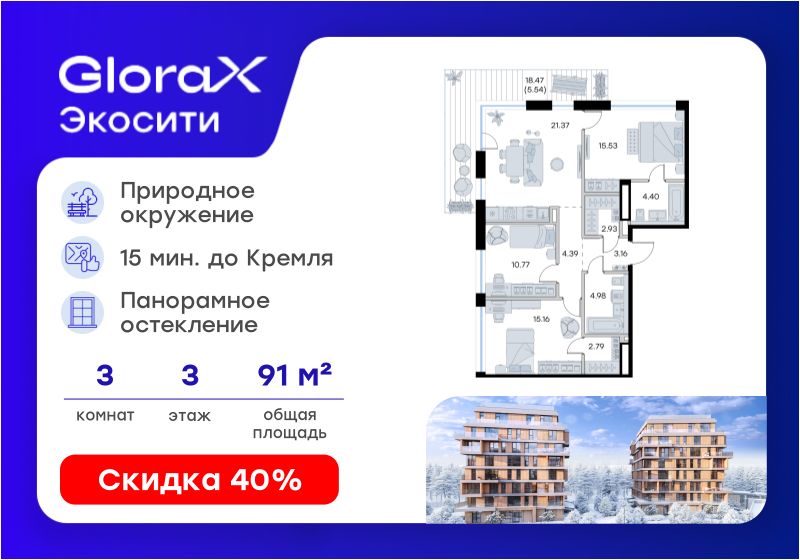 Продается 3-комн. квартира на 3-м этаже в строящемся проекте GloraX Экосити. Общая площадь лота составляет 91,02 кв. м, из которых 41,46 кв. м отведено под жилую и 21,37 кв. м под кухонную зону. Номер квартиры - 12