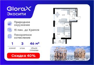 Продается 1-комн. квартира на 3-м этаже в строящемся проекте GloraX Экосити. Общая площадь лота составляет 46,38 кв. м, из которых 13,67 кв. м отведено под жилую и 16,99 кв. м под кухонную зону. Номер квартиры - 17 Преимущества резиденции в квартале "Резиденции": - перегородки межкомнатные перегородки в 1 кирпич, в С/У в 2 кирпича с заведением гидроизоляции на 20 см - потолки - без отделки - полы в помещениях: жилые комнаты, гардеробная, коридор, прихожая, кухня - шумоизоляция пола, стяжка -полы во влажных помещениях - гидроизоляция, стяжка -водоснабжение -ввод ХВС, ГВС, канализации в ближайший СУ/в квартиру - электрический щит - временный, при входе в квартиру - отопление - горизонтальная разводка в полу с установкой - входная дверь - металлическая входная дверь с декоративной накладкой - На территории Урбан-квартала предусмотрено строительство детского сада на 360 мест, школы на 1501 место, детский развивающий центр на 2000 мест. - Рядом с с кварталом Резиденции запланировано строительство детского сада на 360 мест, школы с детским развивающим центром на 1501 место - На первых этажах домов Урбан-квартала запроектированы коммерческие помещения - предусмотрены места для супермаркетов, бытовых услуг, кафе. - Собственный комьюнити-центр для жителей Урбан-квартала - Клуб Резидентов для жителей квартала Резиденции - бульвар "Река между камней" с плейхабом для детей, амфитеатром, спортивными зонами, аллеей достижений. Всем посетителям будет доступен иммерсивный маршрут и AR-игры. - Тайная тропа вдоль которой расположатся зоны тихого отдыха, йоги и медитаций - 2 смотровые площадки - Снейк-ран - Круговой спортивный маршрут - Специальные зоны для выгула собак - В Урбан-квартале предусмотрено строительство 2 многоэтажных паркингов на 300 и 360 машиномест. Всем жителям проекта доступен и привычный плоскостной паркинг вокруг территории проекта с возможностью в приложении дома получить информацию о наличии парковочных мест. - В квартале Резиденции предусмотрен подземный паркинг на 260 машиномест GloraX Экосити — это совершенство города в первозданной природе. Наполненный возможностями квартал, в котором вы не выбираете между городом или природой, семьей или работой, отдыхом или спортом, — вы берете всё сразу. Каждая семья, каким бы составом она ни жила, найдет для себя идеальное пространство. Планировочные решения разнообразны, также как и возможности отделки от черновой до полностью с ремонтом. Здесь запроектированы квартиры с просторной кухней-гостиной, чтобы семья могла комфортно проводить время вместе. Квартиры сдаются с современной качественной отделкой, что позволяет после сдачи дома сразу начать жить, избежав долгих самостоятельных ремонтов. Цветовые решения и стиль отделки можно выбрать при покупке квартиры. Резиденции сдаются в черновой отделке, вы могли реализовать ваши самые смелые дизайнерские решения. Каждая резиденция это база, на которой можно выстроить свой личный стиль. Цена указана при 100% оплате или стандартной ипотеке. Узн