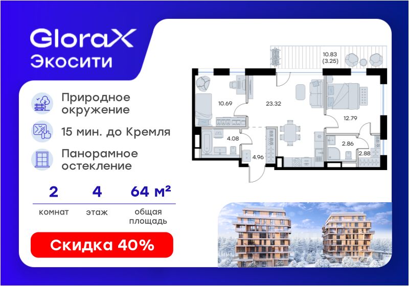 Продается 2-комн. квартира на 4-м этаже в строящемся проекте премиум-класса GloraX Premium Экосити. Общая площадь лота составляет 64,83 кв. м, из которых 23,48 кв. м отведено под жилую и 23,32 кв. м под кухонную зону. Номер квартиры - 19