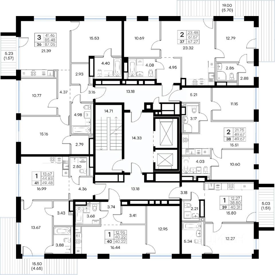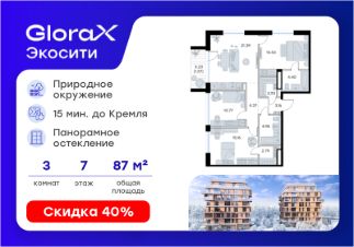 Продается 3-комн. квартира на 7-м этаже в строящемся проекте премиум-класса GloraX Premium Экосити. Общая площадь лота составляет 87,05 кв. м, из которых 41,46 кв. м отведено под жилую и 21,39 кв. м под кухонную зону. Номер квартиры - 36