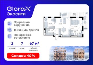 Продается 2-комн. квартира на 7-м этаже в строящемся проекте премиум-класса GloraX Premium Экосити. Общая площадь лота составляет 67,27 кв. м, из которых 23,48 кв. м отведено под жилую и 23,32 кв. м под кухонную зону. Номер квартиры - 37
