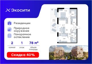 Продается 2-комн. квартира на 1-м этаже в строящемся проекте Экосити. Общая площадь лота составляет 78,76 кв. м, из которых 27,50 кв. м отведено под жилую и 22,77 кв. м под кухонную зону. Номер квартиры - 45