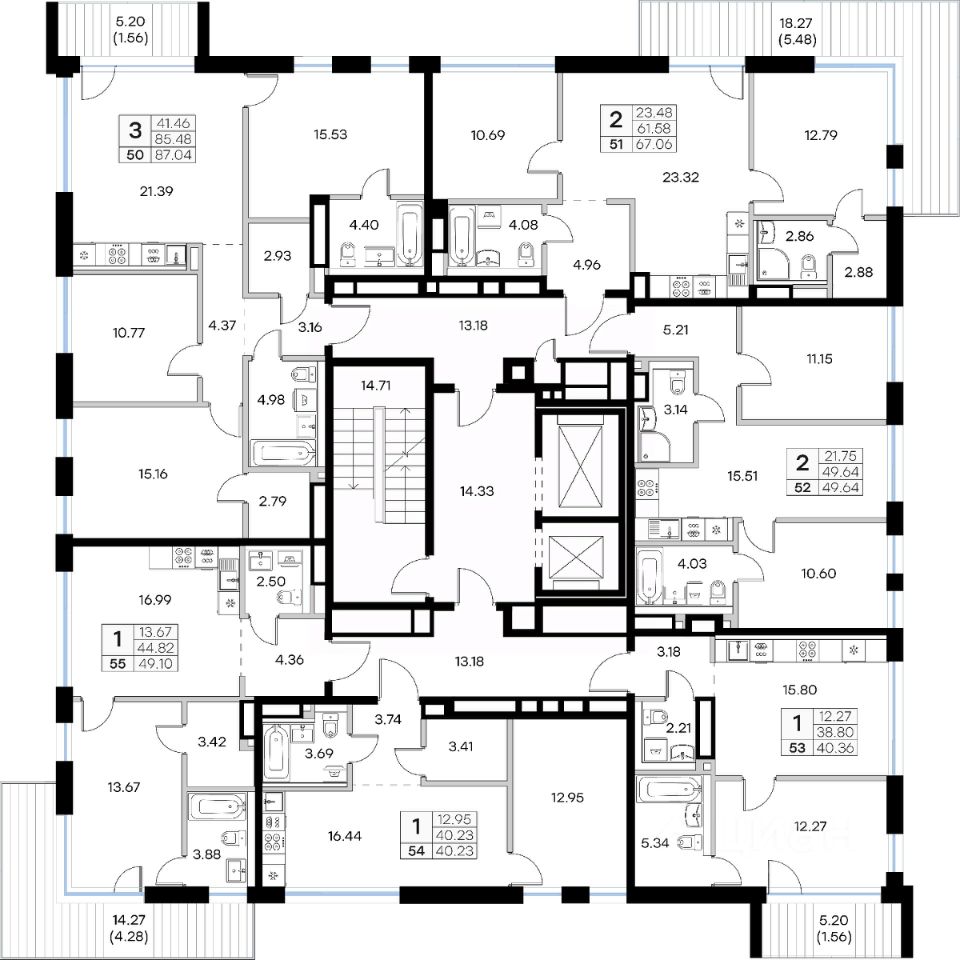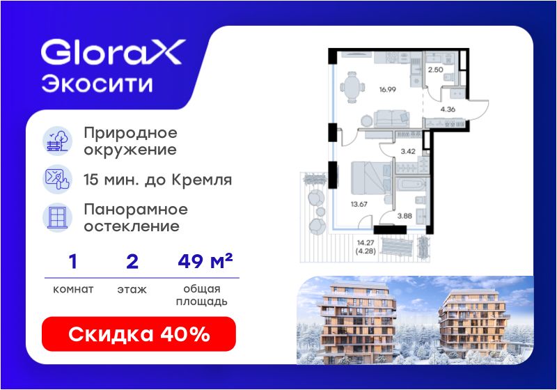 Продается 1-комн. квартира на 2-м этаже в строящемся проекте GloraX Экосити. Общая площадь лота составляет 49,10 кв. м, из которых 13,67 кв. м отведено под жилую и 16,99 кв. м под кухонную зону. Номер квартиры - 55