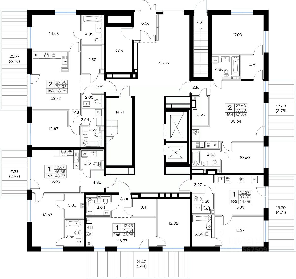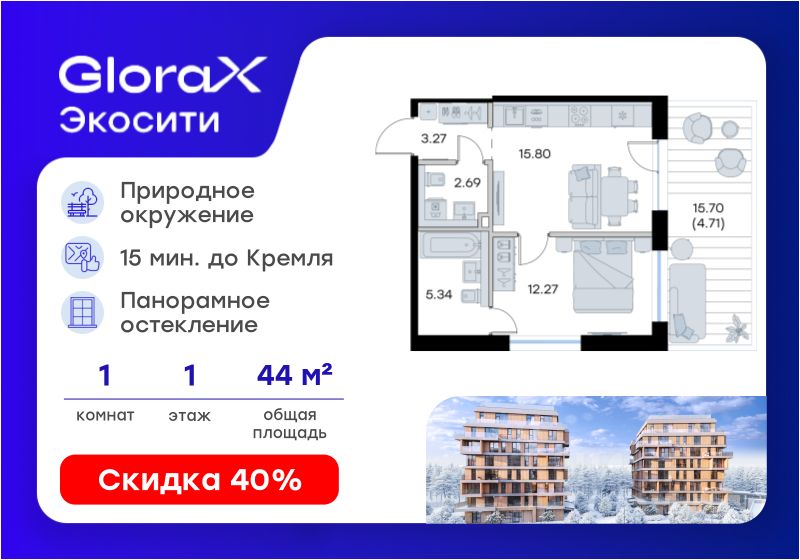 Продается 1-комн. квартира на 1-м этаже в строящемся проекте премиум-класса GloraX Premium Экосити. Общая площадь лота составляет 44,08 кв. м, из которых 12,27 кв. м отведено под жилую и 15,80 кв. м под кухонную зону. Номер квартиры - 165