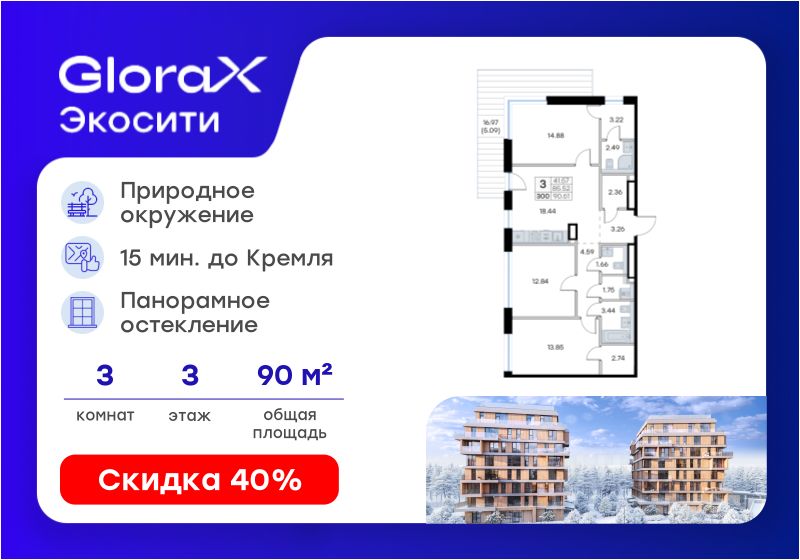 Продаётся 3-комнатная квартира в строящемся доме (Урбан-блок 2), срок сдачи: II-кв. 2028, общей площадью 90.61 кв.м., на 3 этаже. Проект "GloraX Экосити" - настоящий оазис природы в черте города. Масштабный проект комфорт-класса расположится в спокойном зеленом районе Аракчино Кировского района. Те, кто проезжал это место хорошо знают его красоту и аутентичность.