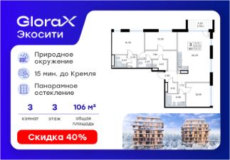 Продаётся 3-комнатная квартира в строящемся доме (Урбан-блок 2), срок сдачи: II-кв. 2028, общей площадью 106.15 кв.м., на 3 этаже. Проект "GloraX Экосити" - настоящий оазис природы в черте города. Масштабный проект комфорт-класса расположится в спокойном зеленом районе Аракчино Кировского района. Те, кто проезжал это место хорошо знают его красоту и аутентичность.