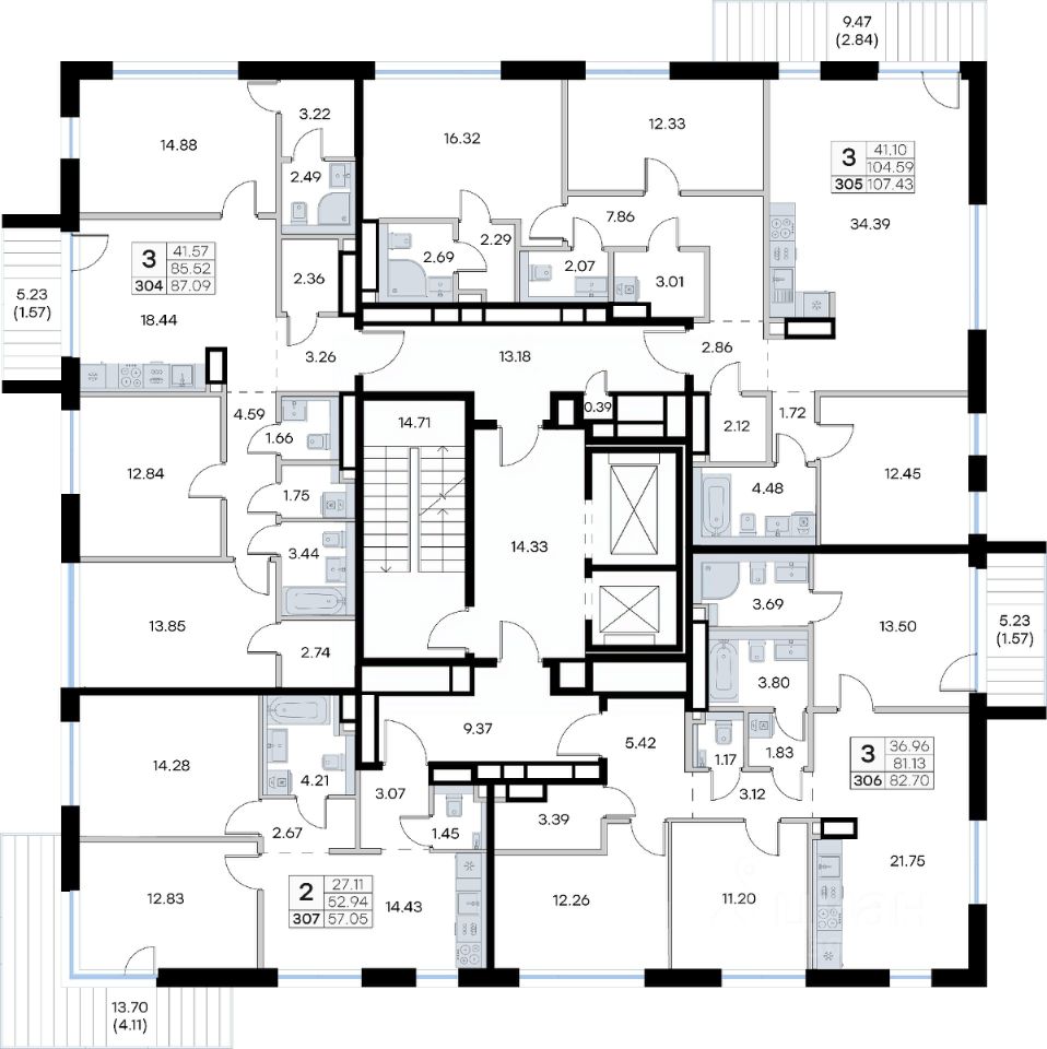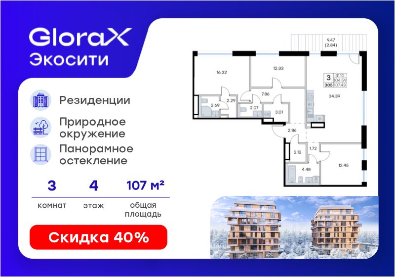 Продается 3-комн. квартира на 4-м этаже в строящемся проекте GloraX Экосити. Общая площадь лота составляет 107,43 кв. м, из которых 41,10 кв. м отведено под жилую и 34,39 кв. м под кухонную зону. Номер квартиры - 305