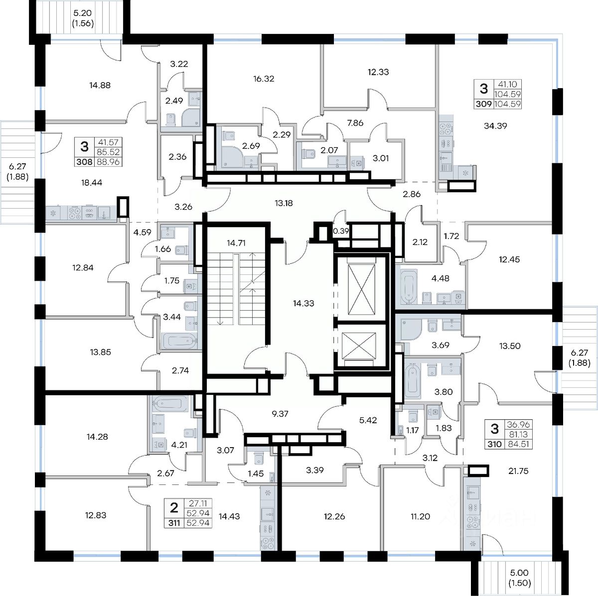 Продается 3-комн. квартира на 5-м этаже в строящемся проекте GloraX Экосити. Общая площадь лота составляет 104,59 кв. м, из которых 41,10 кв. м отведено под жилую и 34,39 кв. м под кухонную зону. Номер квартиры - 309