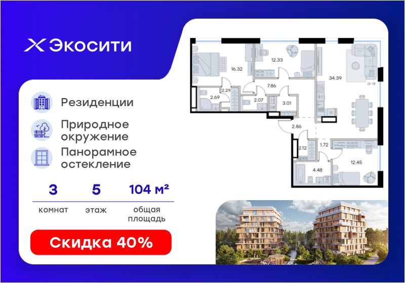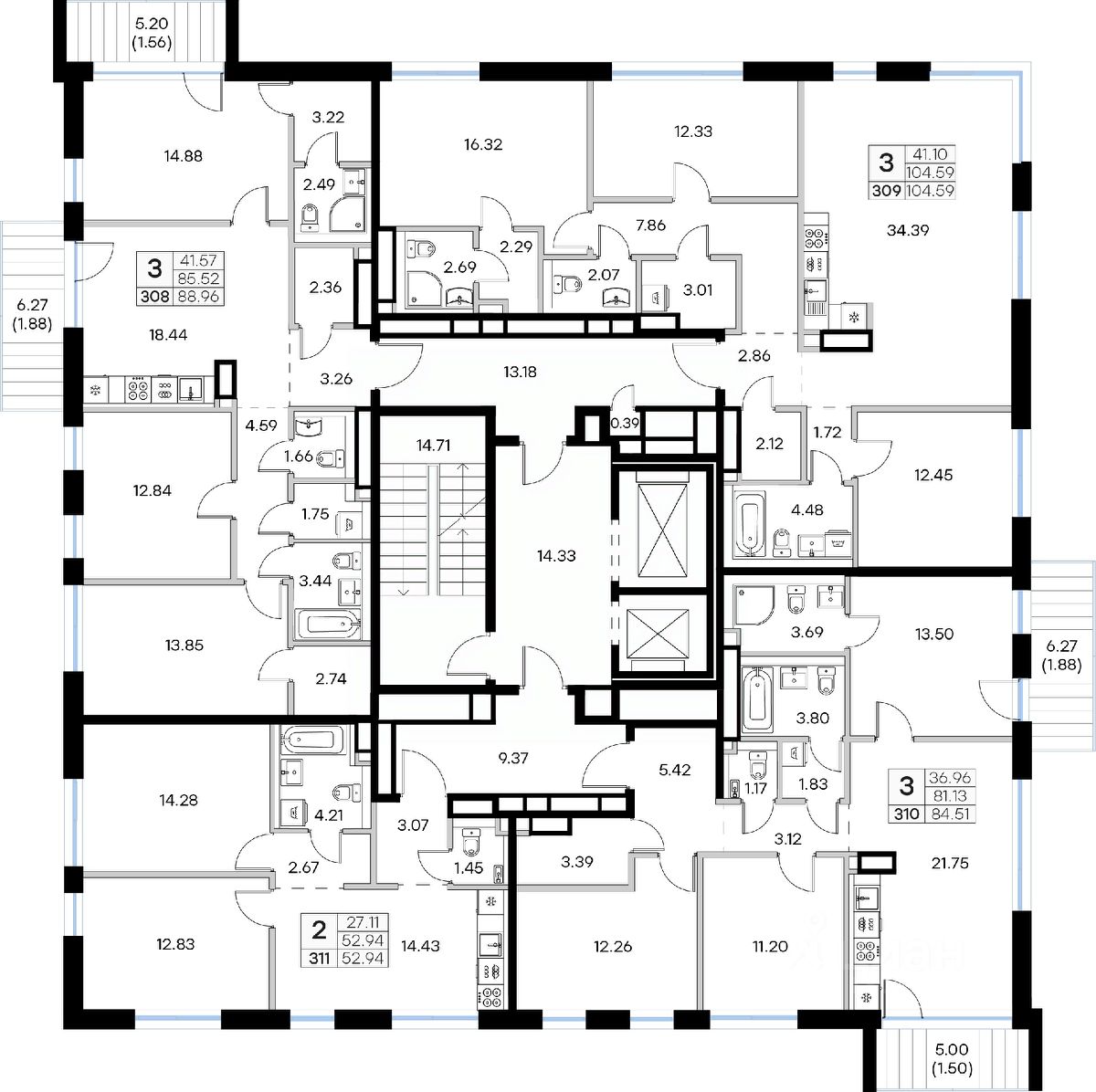 Продается 3-комн. квартира на 5-м этаже в строящемся проекте Экосити. Общая площадь лота составляет 104,59 кв. м, из которых 41,10 кв. м отведено под жилую и 34,39 кв. м под кухонную зону. Номер квартиры - 309