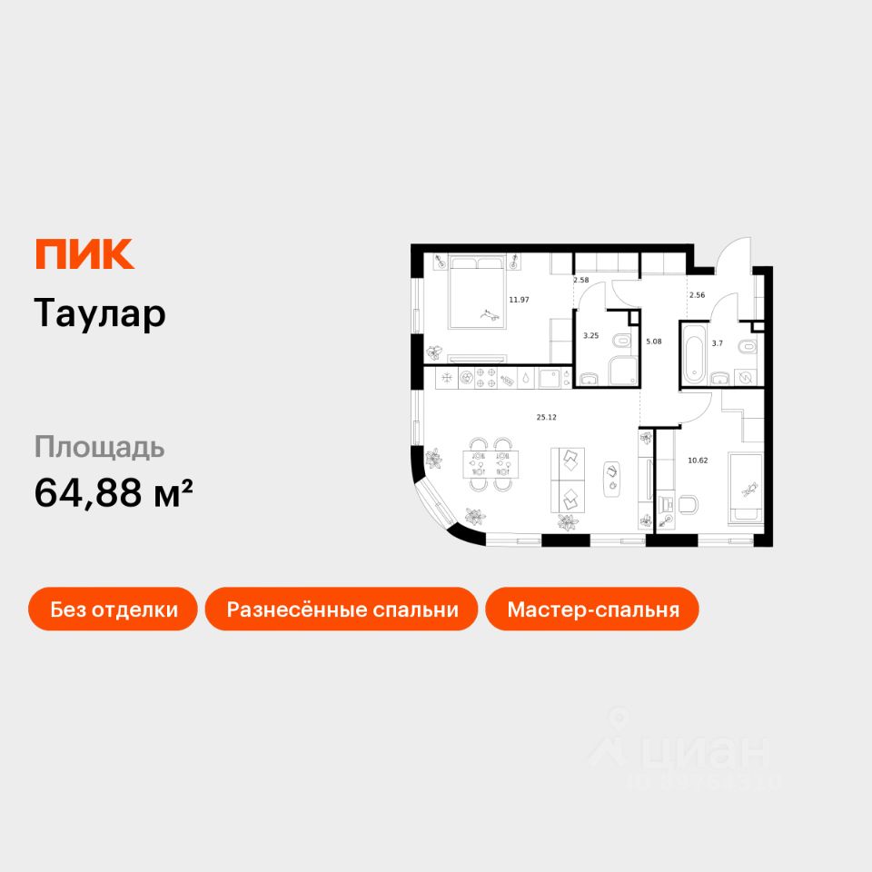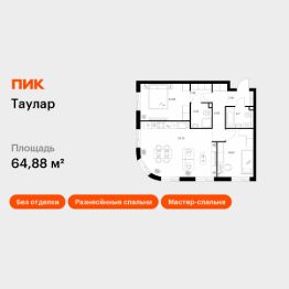 Продаётся 2-комн. квартира площадью 64,88 кв.м на 6 этаже 24 этажного дома (Корпус 1, Секция 1) проекта ПИК Таулар. Светлый просторный подъезд на уровне земли, функциональная планировка, большие окна, без отделки.