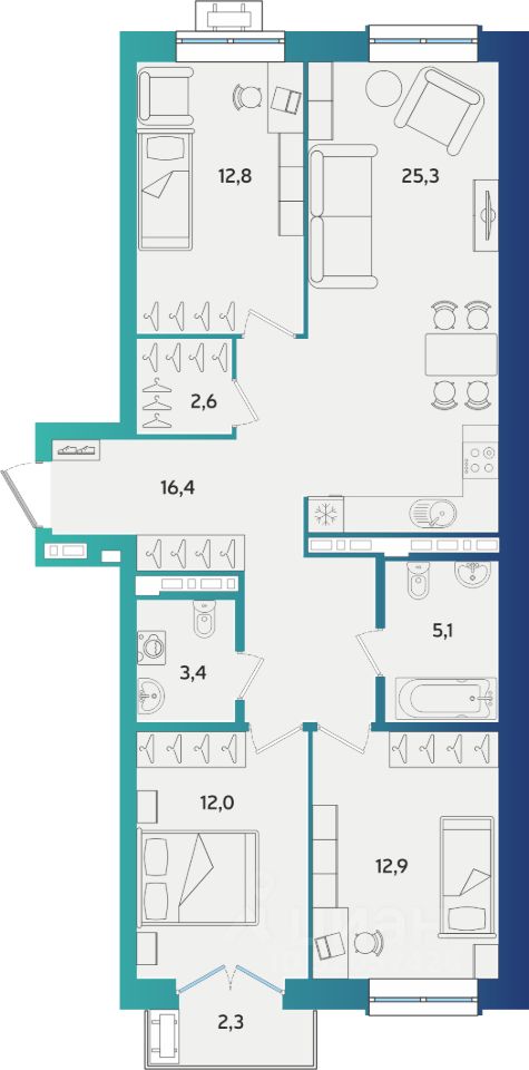 Продаётся 3-комнатная квартира в строящемся доме (Дом А-4.2), срок сдачи: IV-кв. 2026, общей площадью 90.69 кв.м., на 3 этаже. Новый жилой комплекс "Экополис А4-1" от застройщика "ГК АСПЭК-Домстрой" расположен по адресу город Альметьевск, Объездная улица.