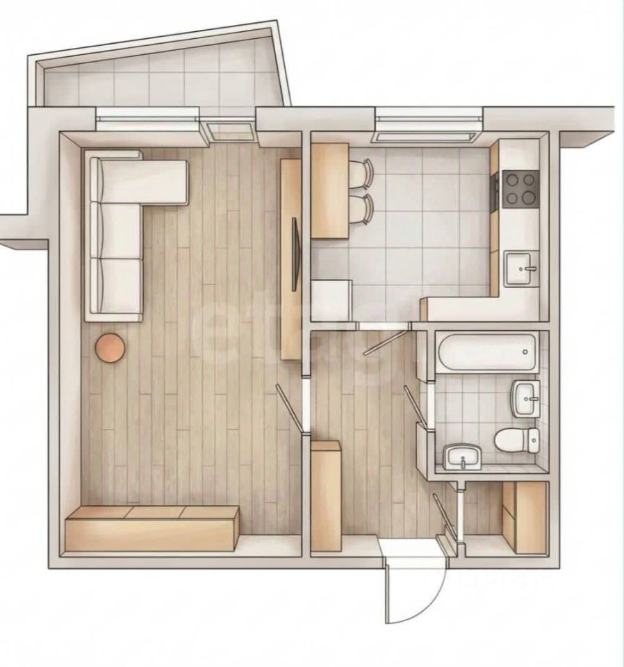Рациональная планировка включает функциональную кухню площадью 7.3 кв.м., где легко разместится кухонный гарнитур и обеденная зона, просторную комнату площадью 16.8 кв.м., предназначенную для гостиной или спальни, и отдельную удобную нишу под гардеробную, способствующую грамотному хранению вещей.
