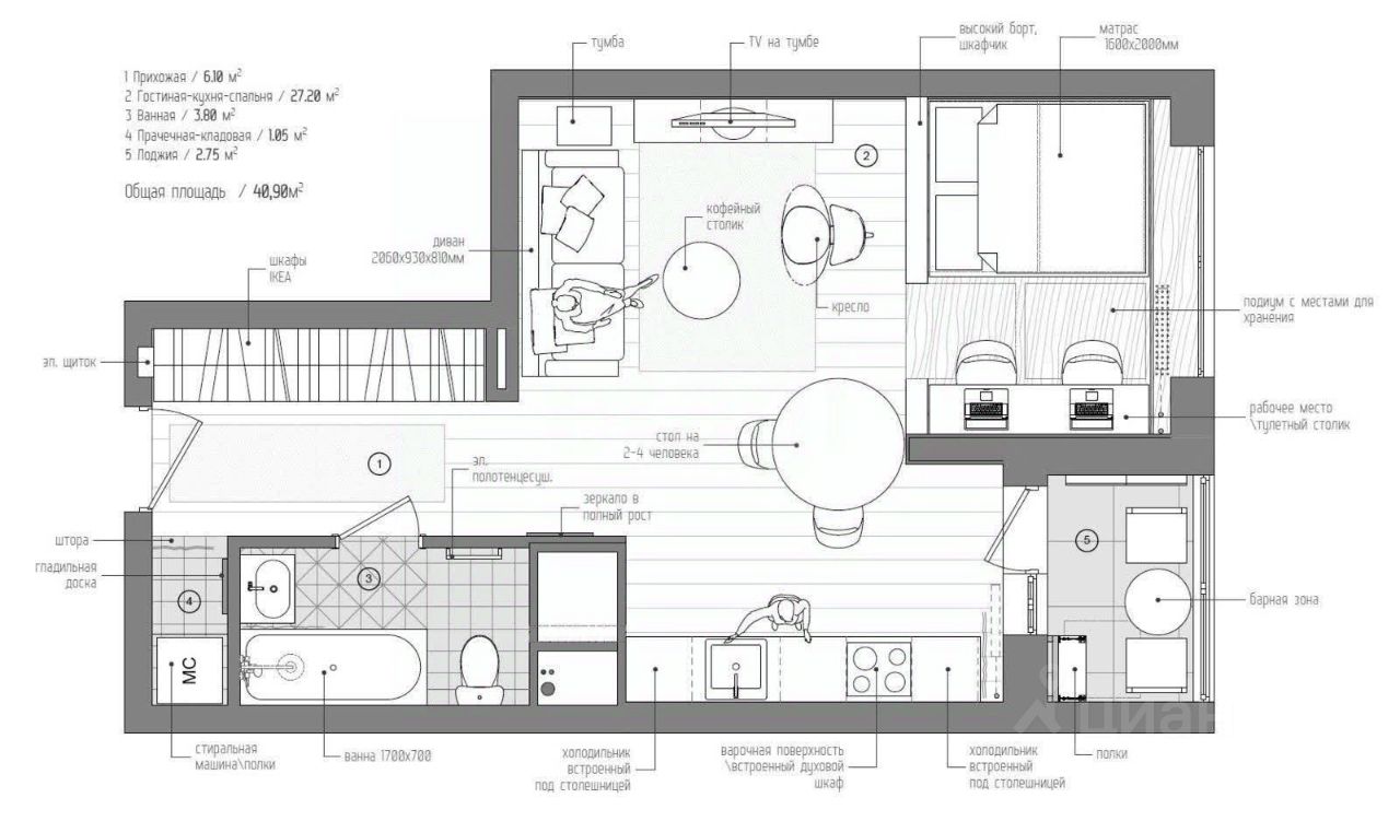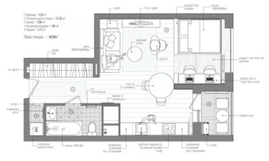 - гоcтиная c кухoнной, обeдeннoй зонoй и зoнoй отдыха
